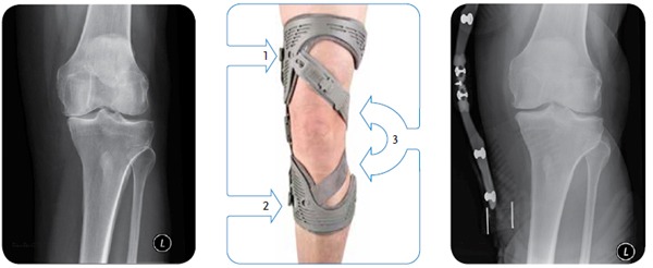 The 3-point leverage device, consisting of a single upright plus diagonal dynamic force strapstm, is the fundamental component of unloader osteoarthritis knee braces.